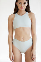 The bottom’s high-rise and full coverage will leave you feeling fashionably safe and secure; while the cheeky cut back add the perfect sexy spin.